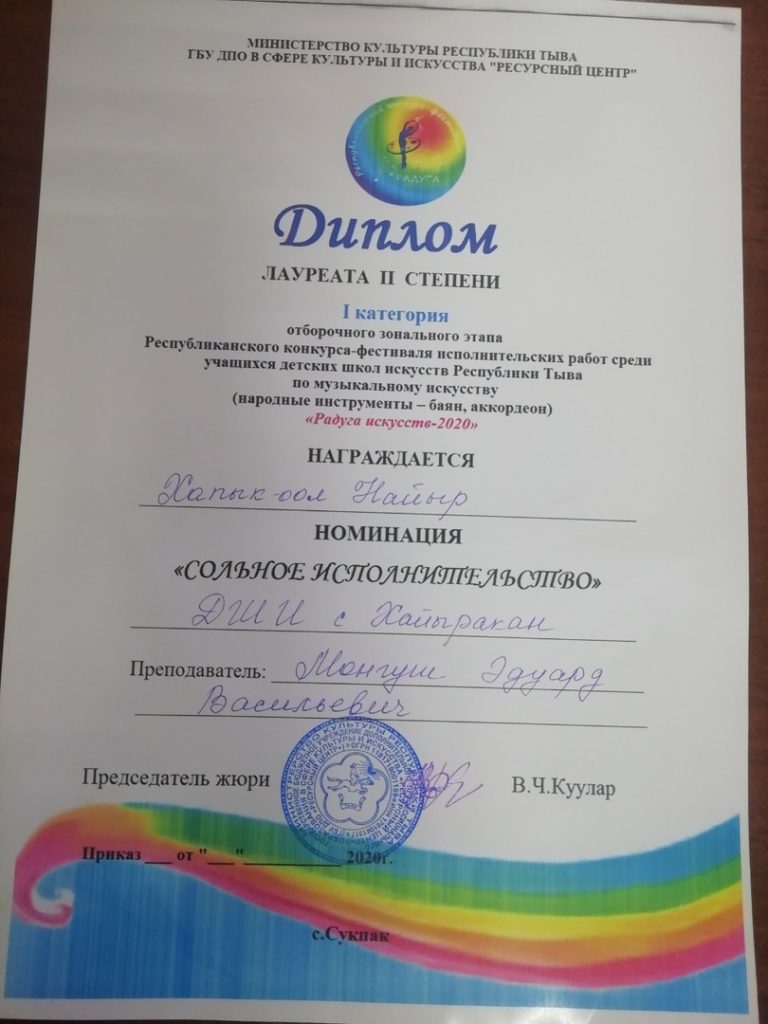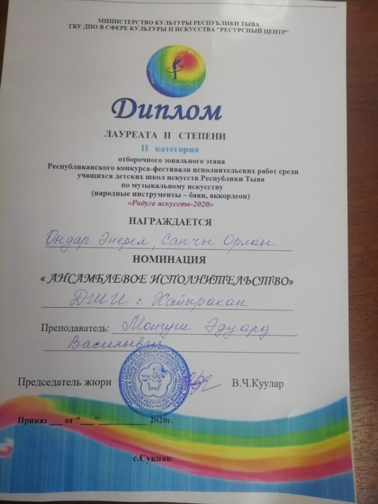29 февраля 2020 года состоялся Зональный этап Республиканского конкурса-фестиваля исполнительских работ учащихся детских школ искусств Республики «Радуга искусств-2020» в номинации «Народные инструменты». В данном конкурсе приняли участие учащиеся класса баян Хапык-оол Найыр, Ондар Энерел и Санчы Орлан, и удостоены следующих результатов: