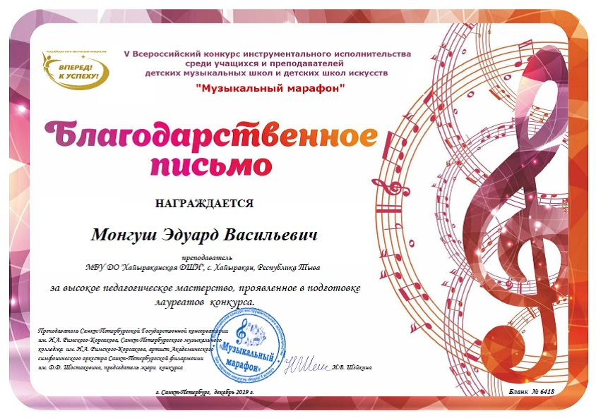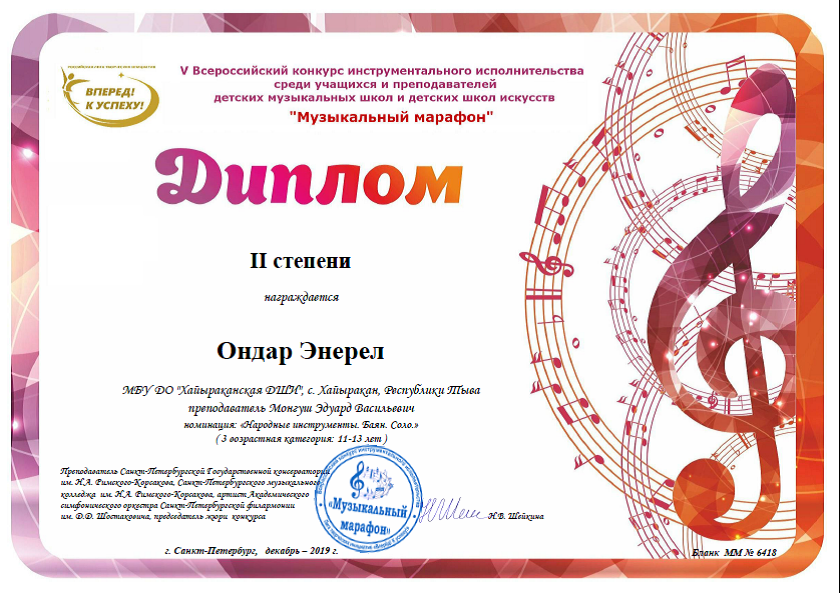 Поздравляем ученика класса баян Ондар Энерел и преподавателя класса баян Монгуш Эдуард Васильевича, за получением диплома 2 степени и благодарности в V Всероссийском конкурсе инструментального исполнительства среди учащихся и преподавателей детских музыкальных школ и детских школ искусств «Музыкальный марафон». Желаем дальнейших успехов!