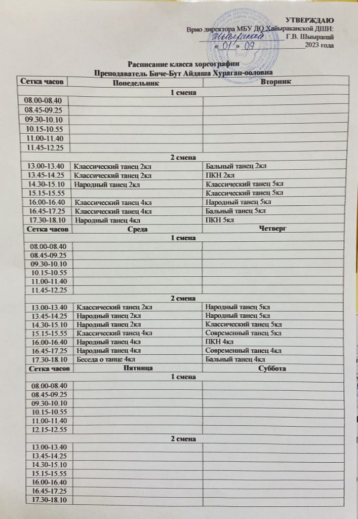 Расписание класса «Хореографии»